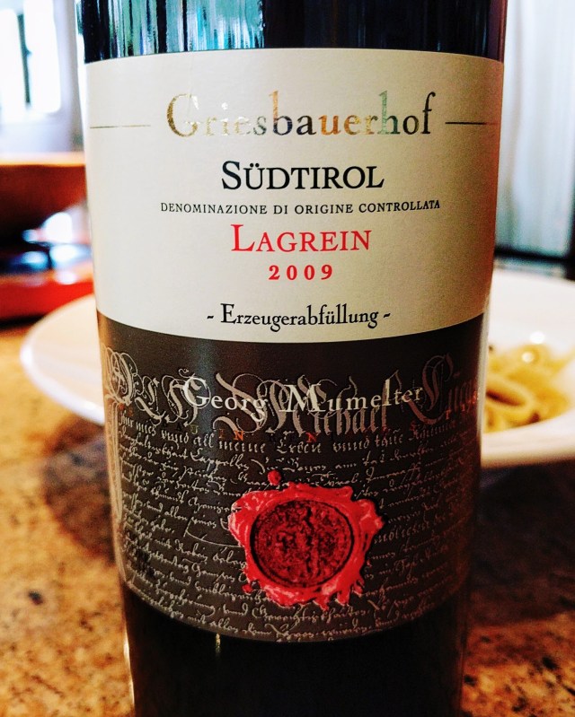 As I surveyed the scene it felt much like a dish from northeastern Italy — almost to Austria, except there the sausage would be pork, and the vegetables would include cabbage. Fortunately, I remembered that I had a bottle of 2009 Lagrein in the cellar, purchased locally from importer Jeannie Rogers (Adonna Imports) about 7 years ago. It was a perfect match, and a great way to spend 1/2 hour in the Südtirol for lunch.