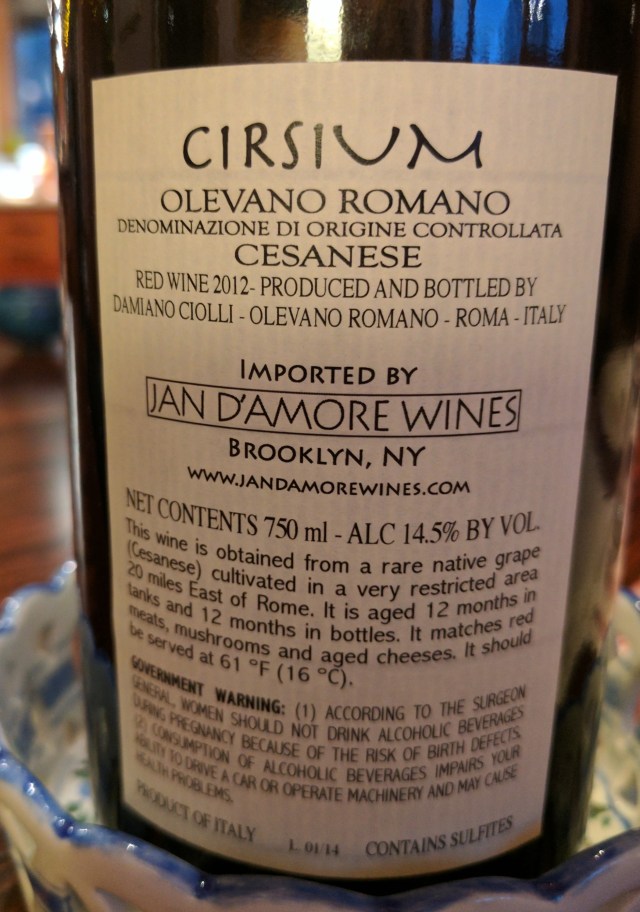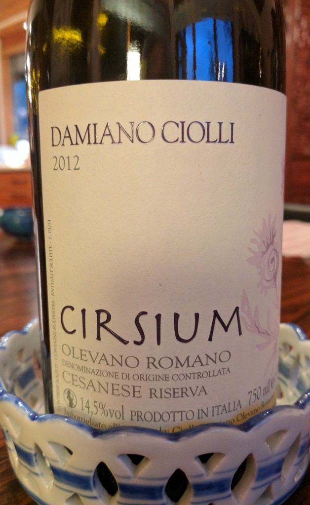 The wine was a marvelous Cesanese Riserva, from Damiano Cioli, imported by Jan D’Amore. This is far and away the best Cesanese I’ve had. It’s produced by a young couple who have transformed the family vineyards to a stunning, natural boutique wine. Sold by Eataly Vino in New York.