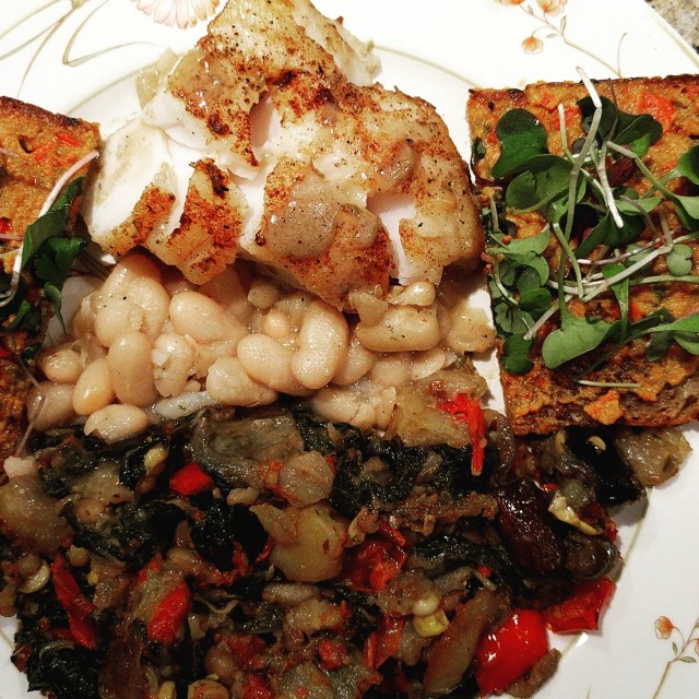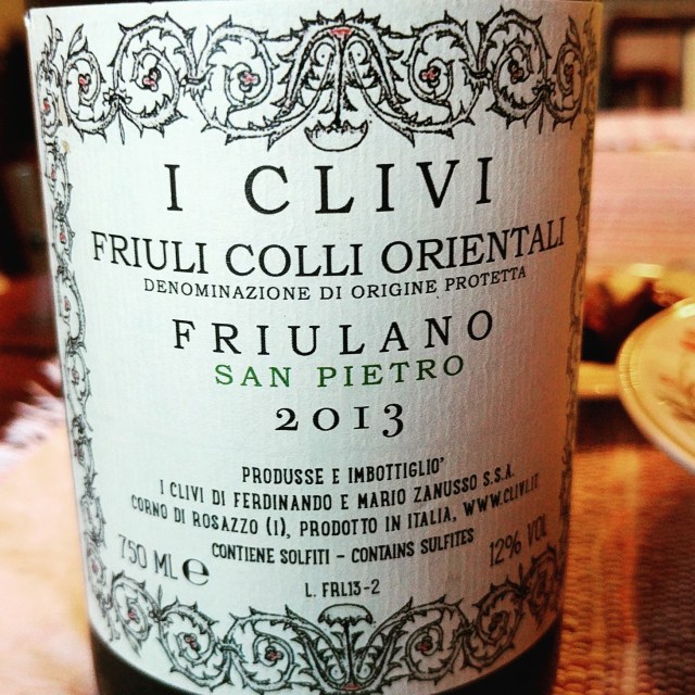 The rest of the plate was filled by reheating the Greek vegetables from yesterday, and grilling a piece of my Triticale bread, on which I had spread a roasted peppers and almond milk ricotta purée. For the wine, I chose the easy (perhaps not optimal) route of the i Clivi Friulano, which I opened at lunch with the risotto. It was an attractive and satisfying meal.