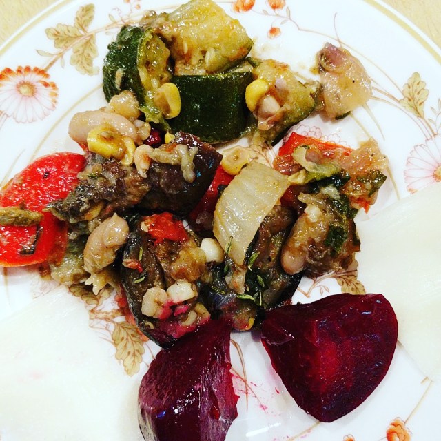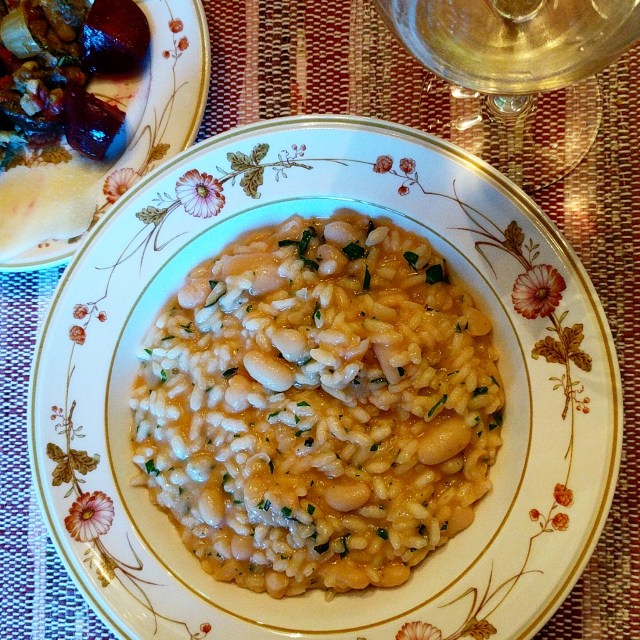 Turn the page to Sunday (today). I had a LOT of cooked beans. I wondered if they would make a good risotto, and I was immediately rewarded with a recipe from Judith Barrett’s Risotto book. So I decided to do Risotto con Fagioli for a full-fledged lunch, accompanied by some leftover Greek baked vegetables and steamed beets as a side dish, all accompanied by a 2013 i Clivi Friulano.