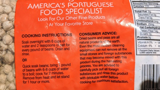 Note the price, and the unusual directions (many food writers insist that salt be added to legumes only after they are all cooked.). These were absolutely delicious, tender, plump, and wholesome.