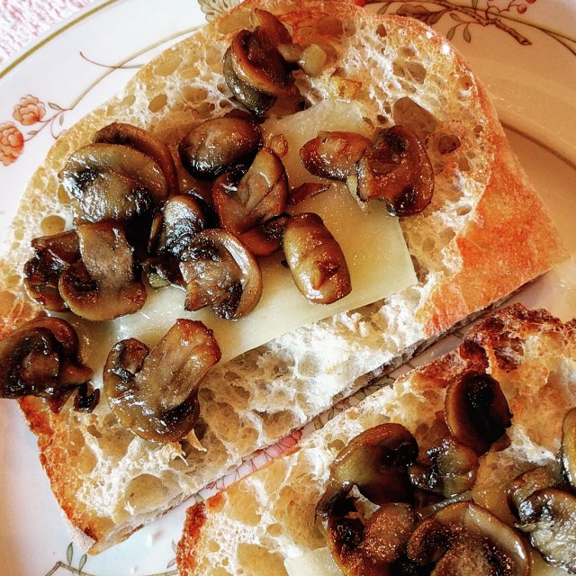 On a more recent note, here are two brief highlights of today’s cooking. Brunch was simple after my breakfast smoothie. I sautéed small white button mushrooms with garlic, sliced a little Tomme de Brebis sheep’s milk cheese from Corsica, and laid it on some toasted Clear Flour Ciabatta.