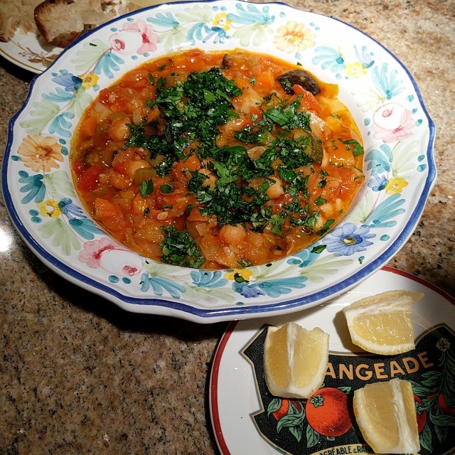 Dinner was more complicated. I had some superb Portuguese dried chickpeas which I had cooked yesterday, so I prepared a Greek style Chickpea Soup. I started with this recipe from Food52, cut the quantities down, and added some sautéed eggplant, zucchini and yellow pepper cubes. The results were very satisfying, served with lemon wedges and toasted Rustic Italian bread from Clear Flour.