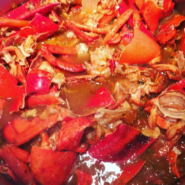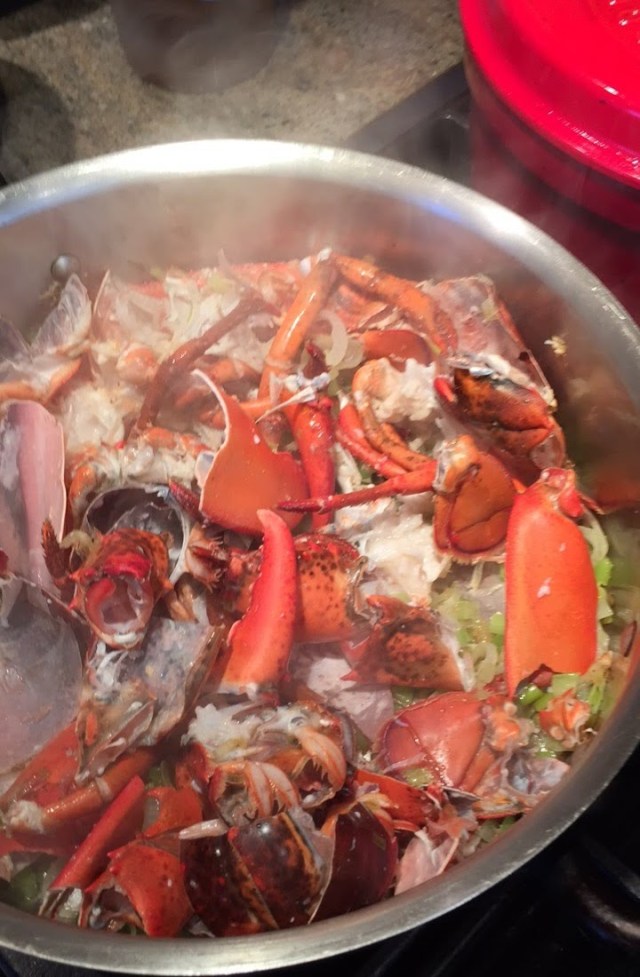 I reserved two lobsters with our friend, Chris, my fish supplier of 31 years. The major effort was preparing the lobster sauce, which is made from further cooking the lobster shells after extracting the meat, along with vegetables, herbs, wine, and cognac. It’s about a three-hour labor of love, but worth it.