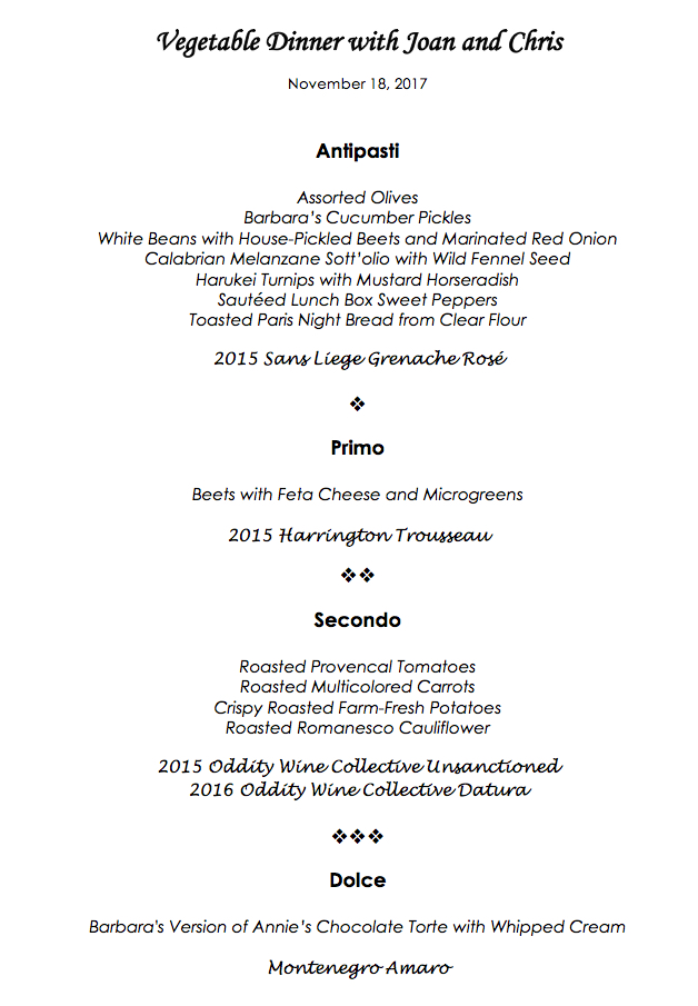 Chris and Joan have been friends for many years, but we don’t often have the opportunity to get all four of us together for food and wine. Two weeks ago, we had such an occasion, and the vegetarian dinner provided a delightful evening of food, wine, and fellowship.