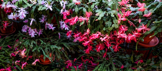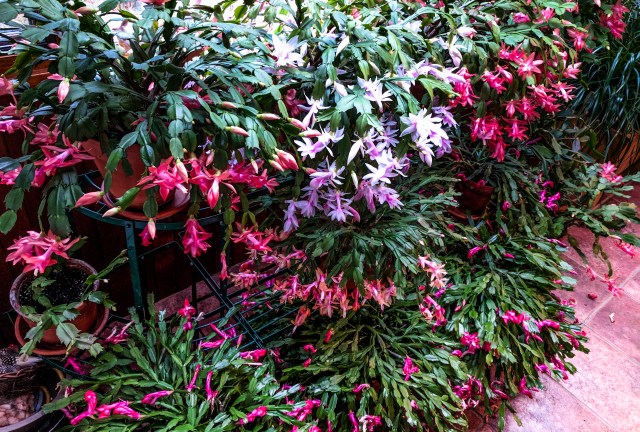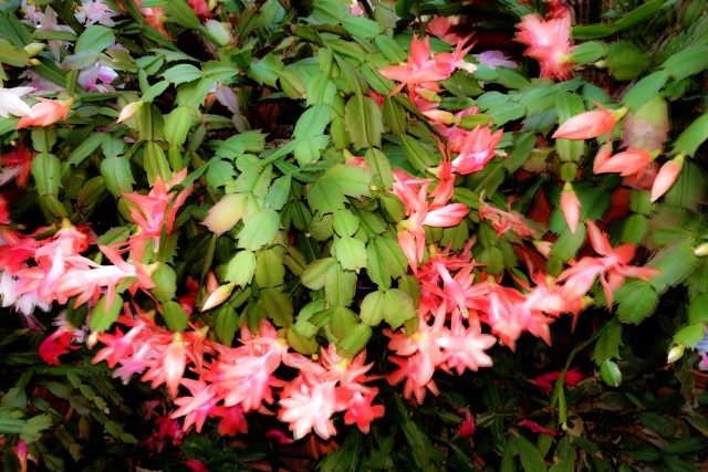 Normally, they have been flowering a month or so after coming indoors, as the days get shorter. Even though they are nominally “Christmas Cacti”, they’ve been blooming more like Halloween or Thanksgiving plants. This year, however, they have exploded with color later than usual and will probably deserve their name. Here’s what they look like now: