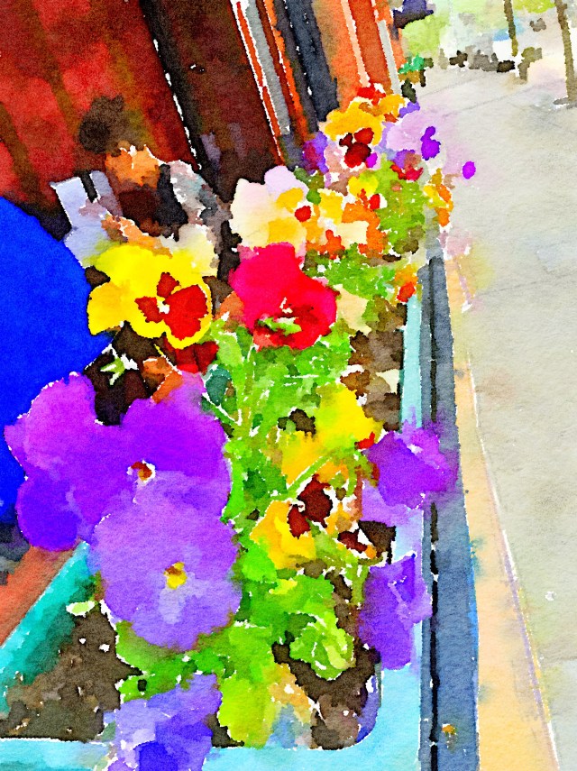 I show you these so that you will know that food and wine aren’t the only sensual delights I care about. In fact these colors reminded me of a photo I took this Spring of flower boxes outside a restaurant in the city. I decided to play with my Waterlogue app and produce this watercolor, inspired by the cactus flowers. These will prepare us effectively for the gray days ahead of Fall and Winter in New England.
