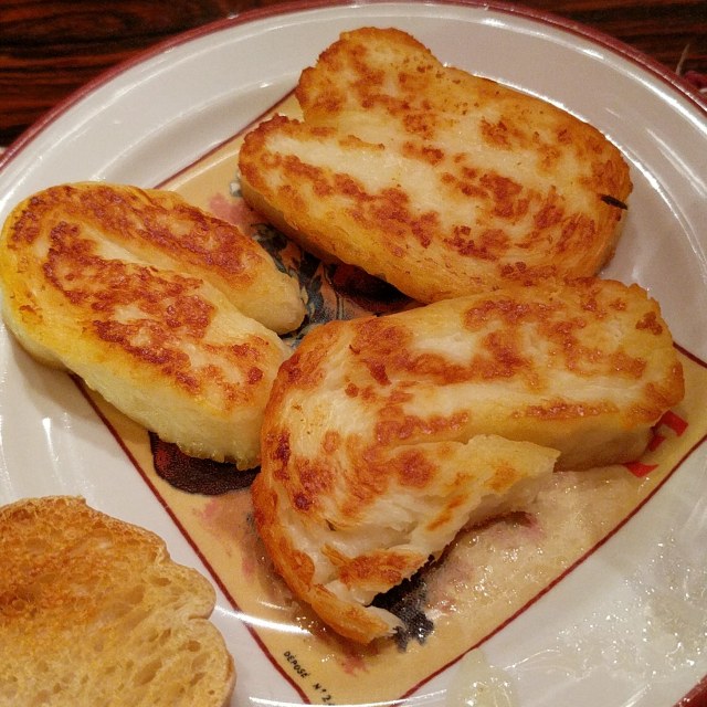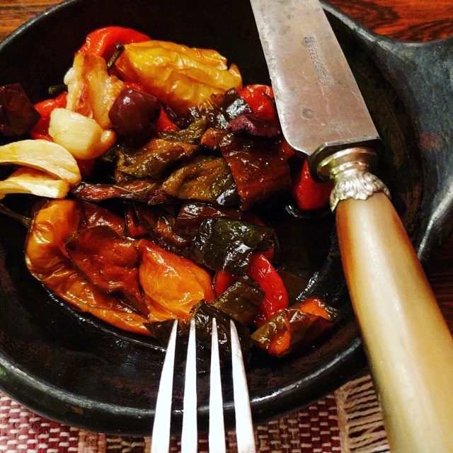 Accompaniment was provided by two side dishes: fried Halloumi cheese (Cyprus), and slow cooked Lunch Box and Poblano Peppers (from our local CSA). The wine was from Greece (naturally) — 2012 Skouras Nemea Agiortiko.