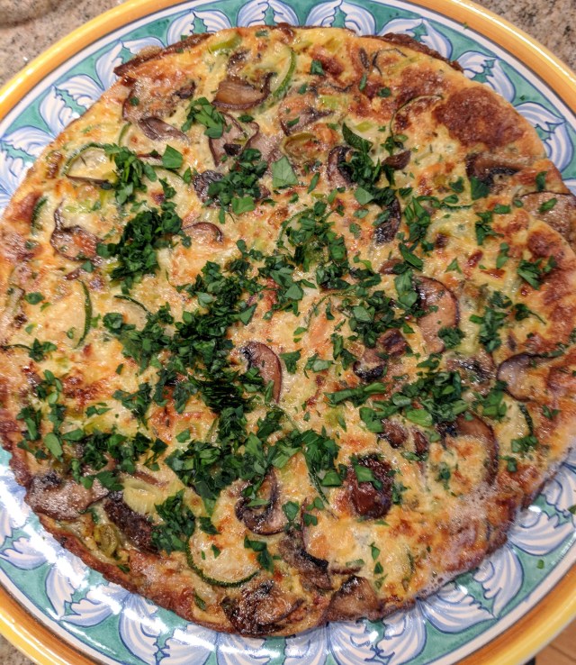 Farm fresh eggs | Grated Parmesan | Leeks | Zucchini | Mushrooms | Parsley | Thyme | Rosemary |