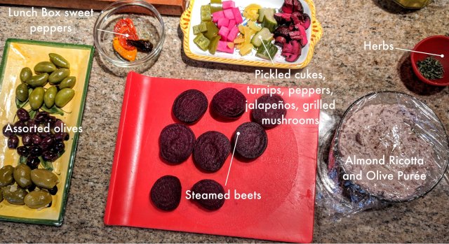 Steamed beets | Almond Ricotta and Olive Pur?e | Assorted olives | Pickled cukes, turnips, peppers, jalape?os, grilled mushrooms | Herbs | Lunch Box sweet peppers |
