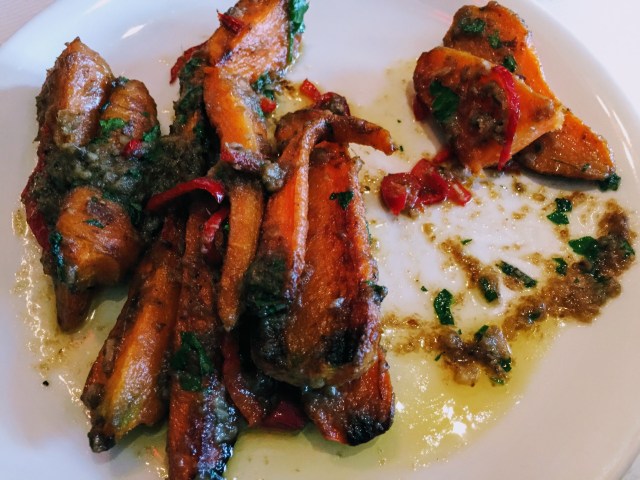 Properly garbed with several layers underneath, I put on my baby Alpaca coat (light and very warm) and my Borsalino hat, opened my portable umbrella, and marched the 75 feet across the street to the restaurant.  I ordered the Cacio e Pepe and a side dish of Roasted Carrot, Anchovy, Garlic & Pickled Chili, accompanied by a glass of the house Bianco.  To my delight, the pasta was perfect, so it was a success.