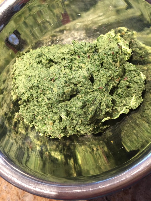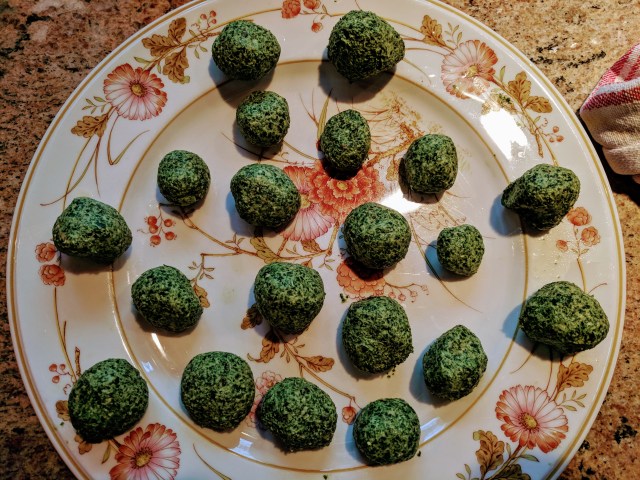 Along with the microgreens from the Greenmarket in New York, I returned with a small container of Stinging Nettles, one of my favorite vegetables and a promising harbinger of Springtime. Naturally, I decided to make homemade pasta and turn it into Tortellini in broth. This was an opportunity to enjoy the nettles (ortica in Italian) and to supplement it with some Swiss chard (not enough nettles to do it alone) and almond milk ricotta. Here is the recipe. My photos below show the filling, which is then rolled into balls for the tortellini, followed by the pasta simmering in the pot, and finally served in a bowl. Barbara helped me a lot making the tortellini, or we would still be waiting for dinner now.