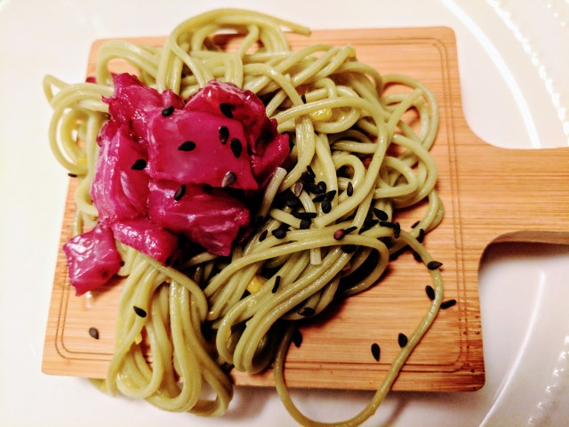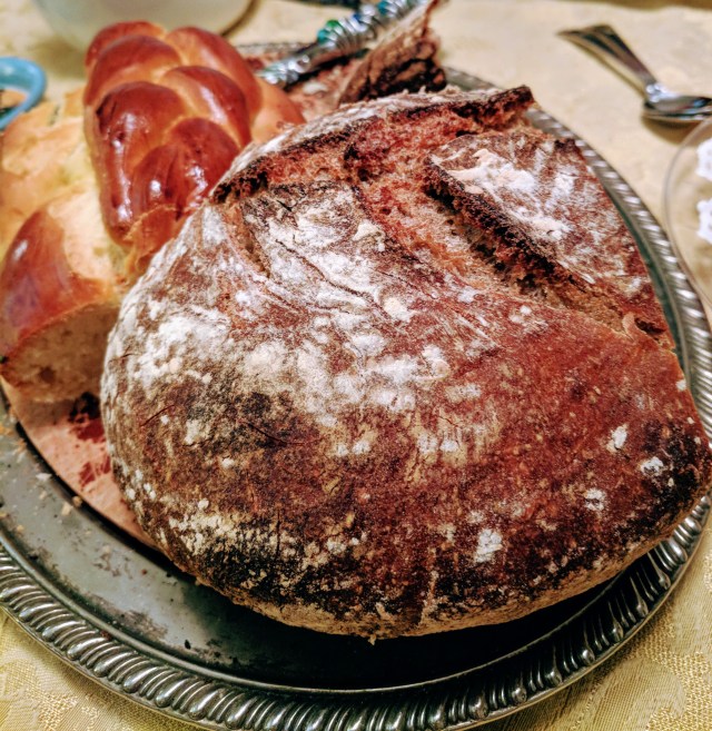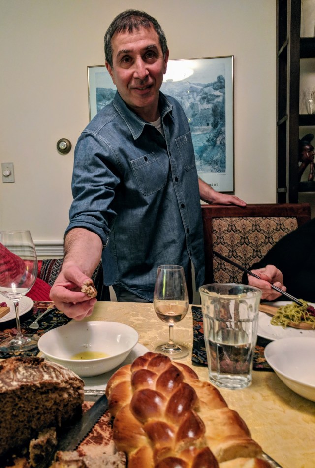 After the New York trip, the weekend back at home was diverse and very enjoyable, too. Friday night we were at our friends David and Susan’s home for Shabbat dinner, which included another couple as well. The meal was amazing, and the whole evening was special. Appetizers included olives and nuts, along with grape tomatoes and smoked sea salt and sliced hearts of palm. The first course was in inventive dish of soba noodles and mango that was deep red from the juice of blood oranges. An excellent spinach salad with walnuts followed, and David asked us to provide bread, so Barbara’s challah and my whole grain Tartine bread went along with the meal. David had just been to Israel, and he had a special olive oil from a kibbutz there, which he shared with us all for the breads.