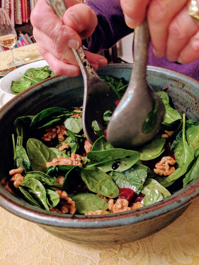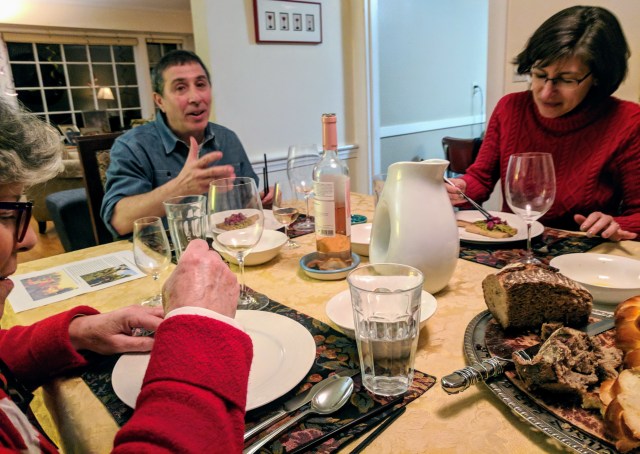 The next course was a full-flavored soup with farro, mushrooms and roasted eggplant. David supplied several delicious wines, and I brought a magnum of Sans Liege’s Transcendentalist, a GSM Rhône-style blend that went nicely. It was fun to be with wine enthusiasts who could share a large bottle with me.