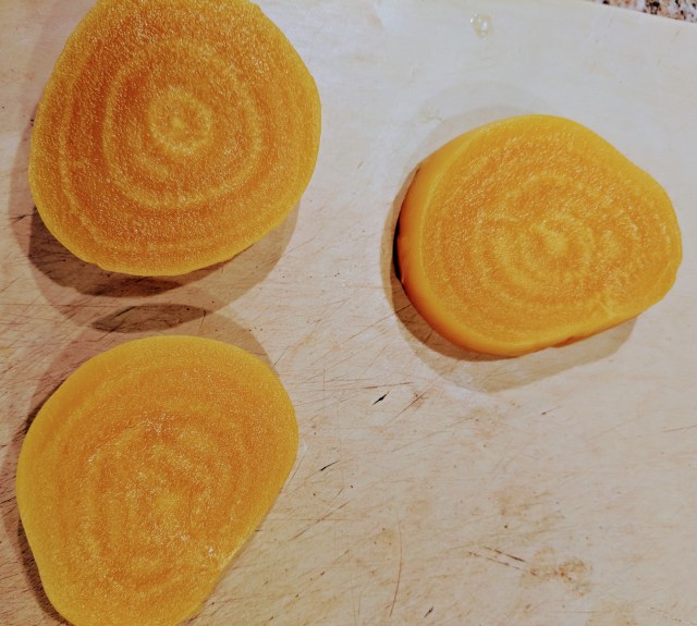 The other trigger was the need to use the beet greens we had saved several days ago from a bunch of golden beets. I had steamed the beets and eaten all but one of them, but I needed to do something with the greens soon. These simply needed to be de-stemmed, washed well, and steamed in a non-stick pan with the liquid attached to the leaves, with a little olive oil and salt. The peppery greens were delicious, so I chopped them and put on a small plate as the base for the dish.