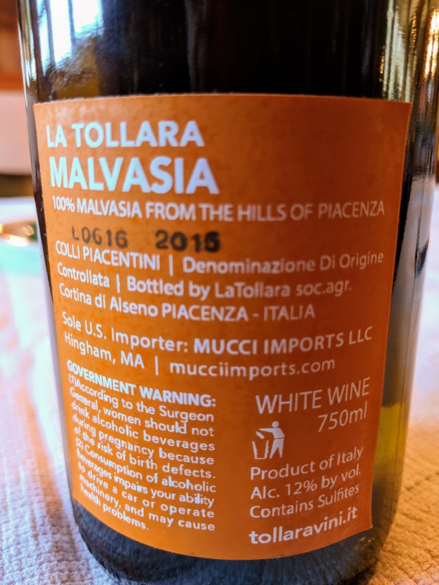 Now, for the wine. I had an open bottle of Soave, but decided it was not acidic enough for this dish. A few days ago I attended a wine tasting in Cambridge for Mucci Wines’ 5th anniversary. One of the truly standout wines at that event was the 2016 Tollara Malvasia D.O.C. I loved meeting the owner and tasting her wines. A few days later, Jeff Nedeau at Farfalle in Concord put aside two bottles for me, and I picked them up over the weekend. Everything came together perfectly, and my lunch experiment was a success.