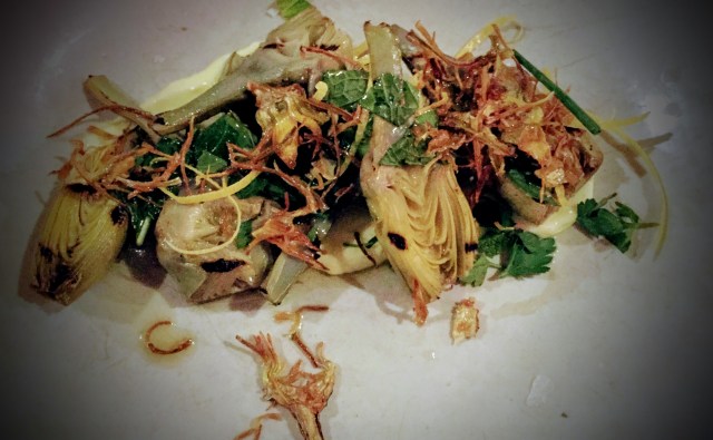 I wasn’t that hungry, so I had just two dishes: a grilled artichoke appetizer, and a squid ink pasta with smoked mussels. The artichoke dish was top-notch.
