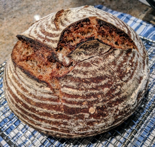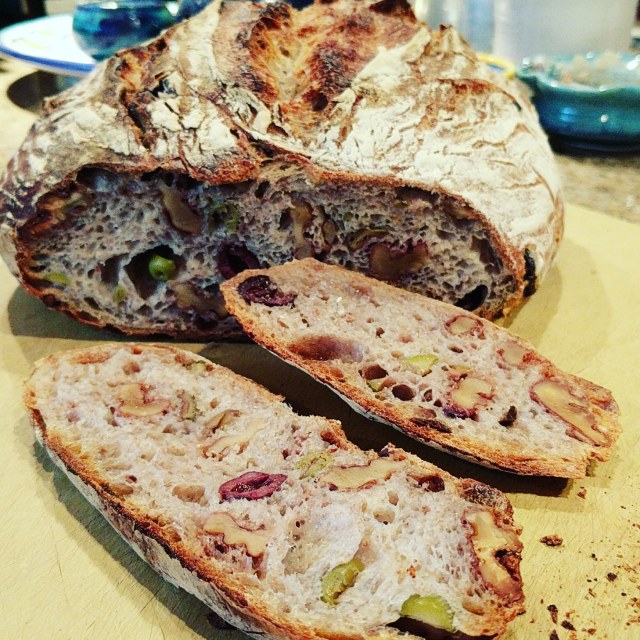 Yesterday was dedicated to developing the doughs — one for a Rye Levain with Caraway Seeds, the other for an Olive-Walnut Levain — two loaves of each. The whole process is 27 hours long, mostly waiting patiently for the 1/2 tsp. of yeast and 100 gm. of my bread starter to do their magic with each batch of flour.