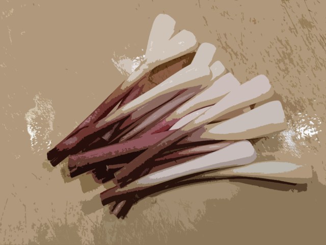 One of my seasonal favorites is the wild leek known as Ramps. I don’t always buy them when I see them, because they can be very expensive ($15-$20/lb.) and frequently look terrible by the time they make it to the market. I did find one lovely batch at Russo’s in late May. I pickled a few and cut up some of the rest of them, cooing the greens separately from the bulbs. Here is an artistic rendition of those two components: