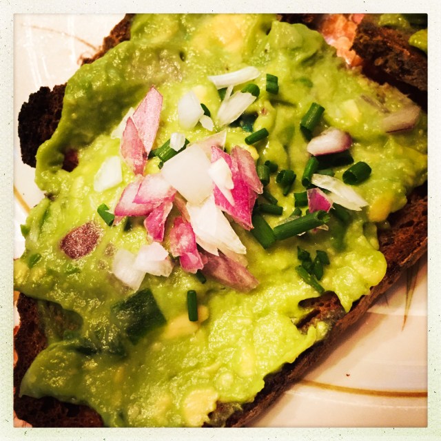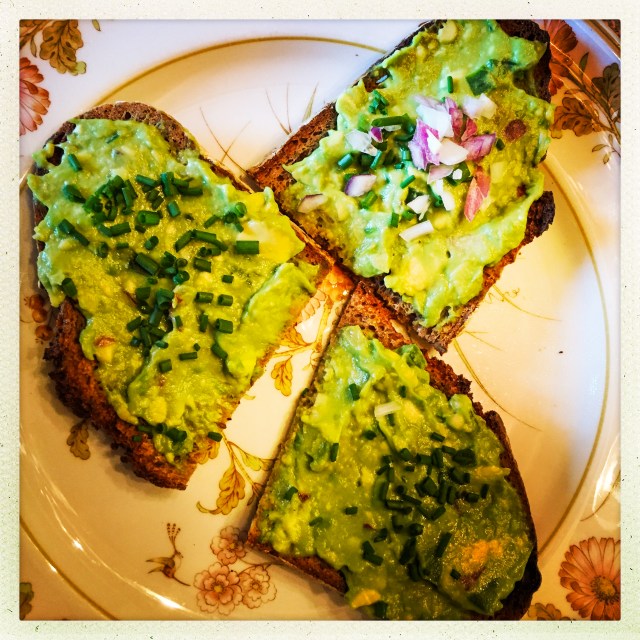Now that I’ve learned how to make guacamole with some zip, it is becoming a more frequent topping for my breads at lunch. Here’s what it looked like on May 23rd: