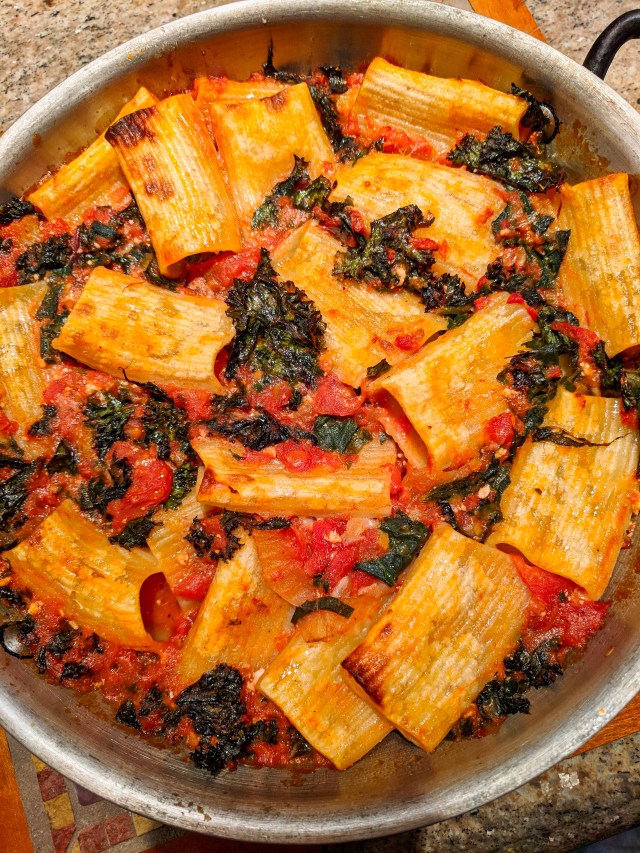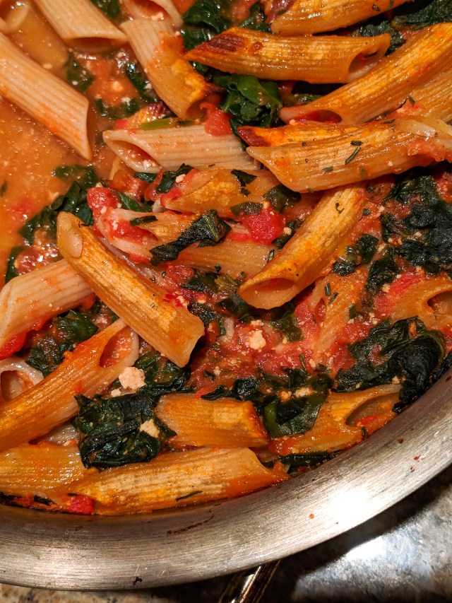One night I played with a large, ribbed pasta, making a baked version with tomatoes and chopped greens. The dish was a good match for a Nebbiolo I bought recently in NY.