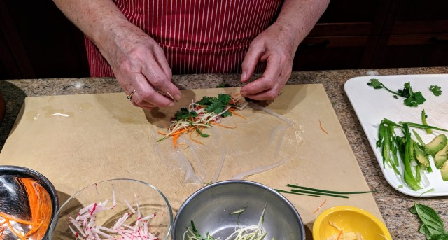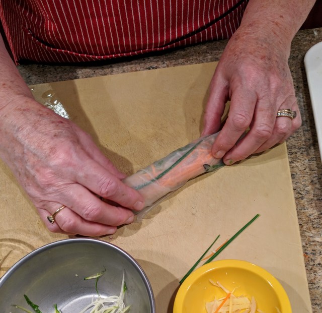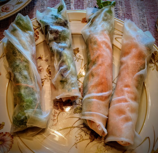 For variety one night, I decided we should do some Vietnamese Spring Rolls, Vegan and delicious. I even remembered where we had some of the dried rice paper needed as the wrapper. Naturally, this called for Barbara’s pastry/dough handling skills, which are considerable and transcend many cultures.