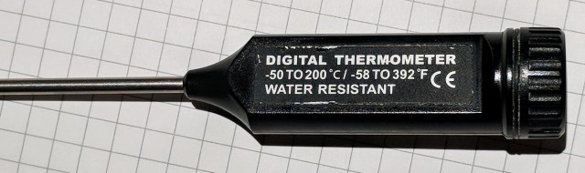 I had two digital tools that were useful. One was the the culinary laser thermometer which I normally use to gauge the pizza oven temperature. This is quick and versatile, but may not be accurate enough to ensure my water temperature is where I want it. The other is a simple digital thermometer, which I always use in breadmaking to be certain the water temperature is correct for making the levain. The latter seems to be the best for gauging water temperature.