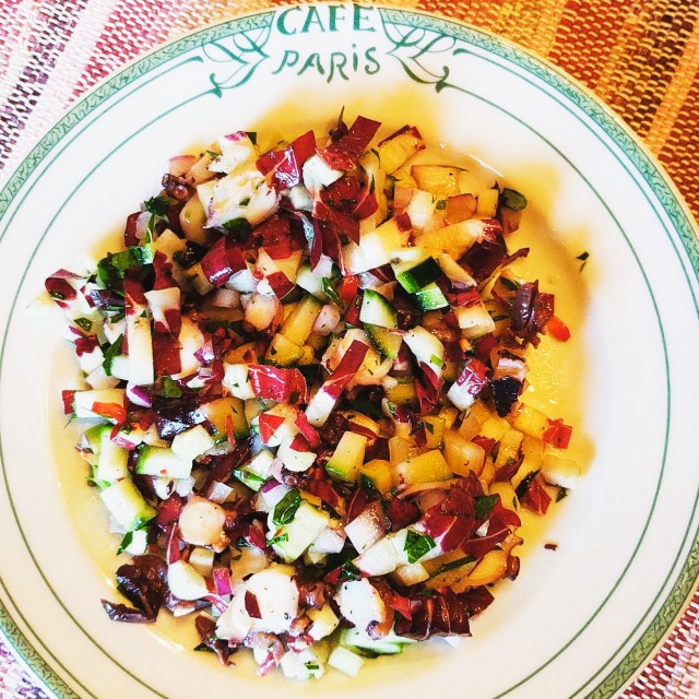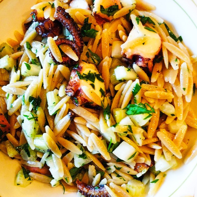 In restaurants I often have a glass of red wine with grilled octopus, figuring that the bold grill flavors will complement a robust wine. However, I may be changing my perspectives on this issue, more toward white wines. In any case on warm summer days and with the three salads I made, the perfect choice was my favorite Assyrtiko from Santorini, the 2016 Estate Argyros. A Portuguese Vinho Verde also works well.