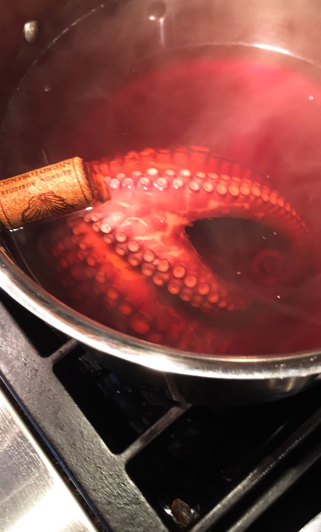 The key things I learned had to do with “simmer until tender”. Most important was not to get the water too hot or too cool. Ideal seems to be between 190º and 200º F. Food scientist Harold McGee helped me on this. His article led me to look up some material about cooking octopus sous vide, and now I know I am looking for a final temperature in the meat to be between 175 and 180º F. I also understand that there is NO WAY to know how long it will take to achieve that temperature. You will see time estimates in recipes from 30 minutes to 3 hours. The truth is, we do not know. You must measure as accurately as possible, and then cut a piece and taste near the end.