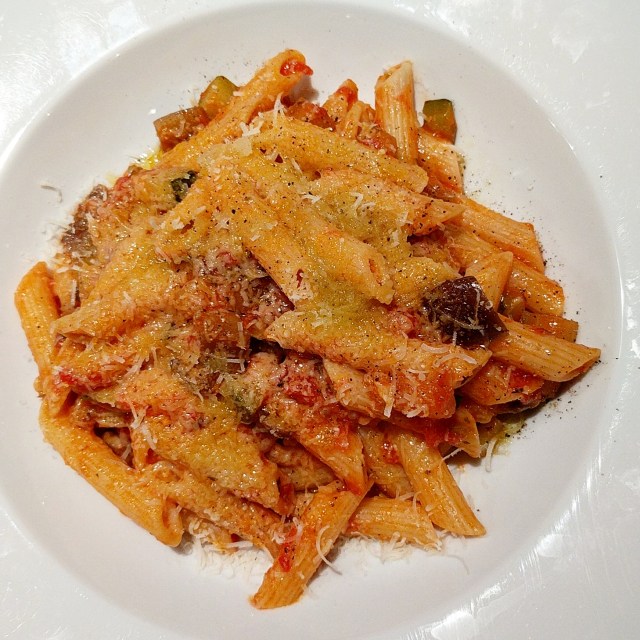 For wine, I had the last glass from the 2014 Odoardi Savuto, which was opened a few days before, when I made a richly-flavored Penne Pasta with Italian Summer Vegetables (eggplant, zucchini, onion, leek, tomato, capers and peppers) for myself: