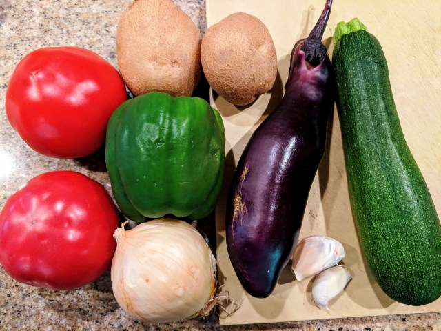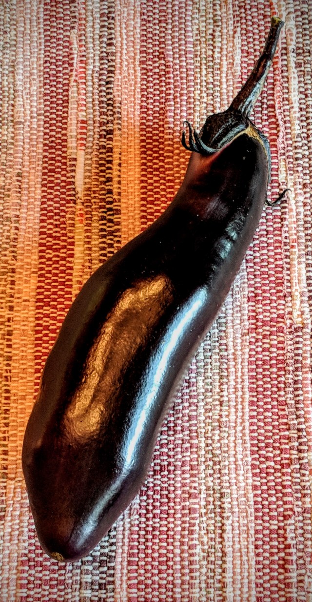 Soufico is really an ideal dish for this time of year. The bounty of fabulous fresh vegetables at local farm stands is all around us. I made a small version of the recipe, for just the two of us. Here is the recipe, followed by the photos, including the eggplant which was our own, from a plant we keep on the deck.