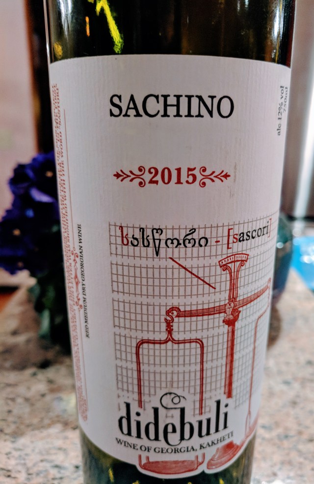 The wine was an unusual but very appropriate choice, a 2015 Sachino from the country of Georgia. It’s a smooth, medium-bodied blend of Saperavi and Rkatsiteli grapes, the first is red, the second, white. I know relatively little about Georgian wines, except that their wine history is probably the oldest in the world, their indigenous grapes are amazing, and they often age their wines in qvevri — earthenware vessels used for fermentation, ageing, and storage of wines. This is not a qvervi wine, but it is inexpensive, easy to drink and goes with a wide variety of summer dishes. It comes from the Kakheti region.