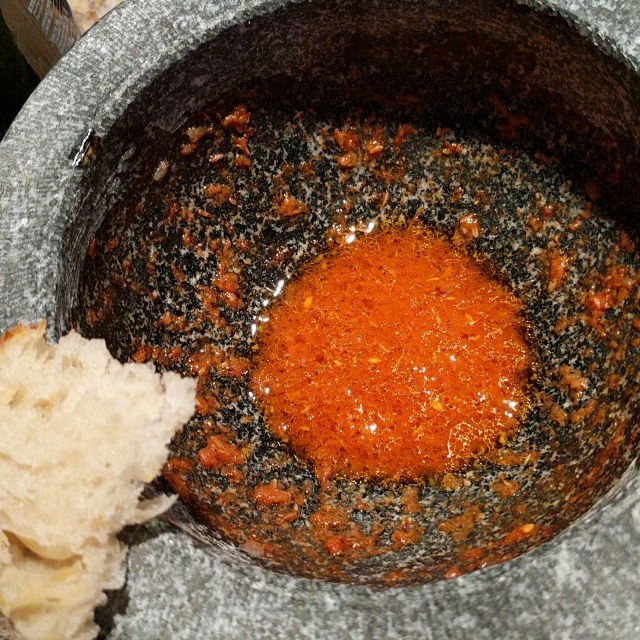 - 2 tablespoons of a Spanish tomato-garlic-cumin vinaigrette I made the previous night