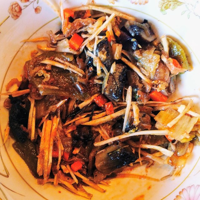 - one leftover grilled Portabello mushroom, with roasted Napa Cabbage pieces and garlic slivers on top. I cut this into 1/2″ cubes.