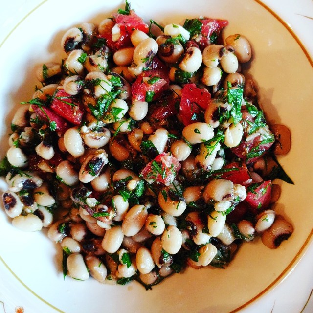 The final dish I wanted to tell you about was a salad: Black-Eyed Pea Salad with Tomatoes.  I wanted to do something with Black-Eyed Peas.  I had some lovely dried Portuguese black-eyed peas that I bought along with terrific Chickpeas at a local Portuguese grocer, so here was my chance.  On a recent Sunday afternoon I cooked the beans.  While they were in process, a little online research produced a good-looking recipe, so I used that as a model and adapted it to what I had available.  Here’s the recipe online: