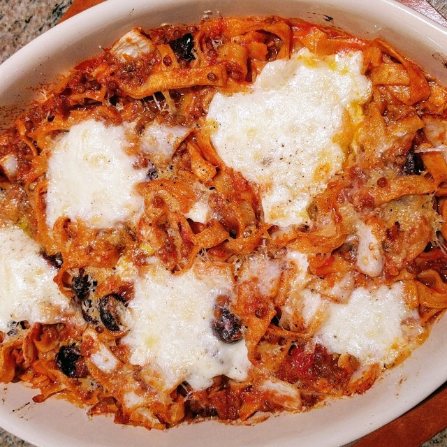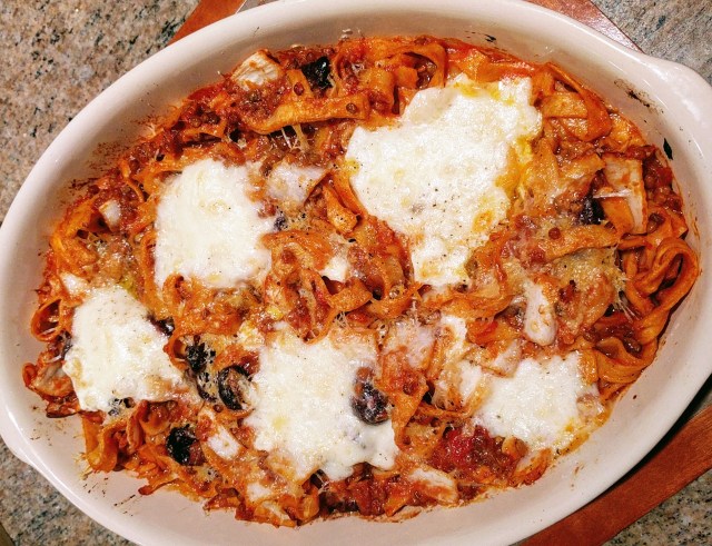 There are two newly-created pasta dishes I wanted to share with you.  Tonight I made a Baked Fettuccine with Tomatoes, Lentils, Burratina, and Gaeta Black Olives.  Somehow, the texture of the lentils, the sweetness of the tomato sauce, and the contrasts of the cheeses and olives worked beautifully.  The fresh tomato fettuccine from Monica’s pasta shop on Richmond Street in Boston’s North End was also excellent, as was the Burratina imported from Puglia by that same shop.