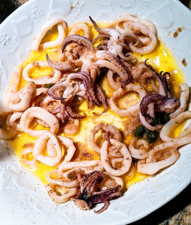 I had some small calamari to play with, so I made this dish, but without the cream (unnecessary in my view). It was perfect!