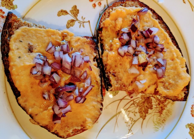How about grilled homemade levain with a red pepper-bean purée and some chopped red onion?