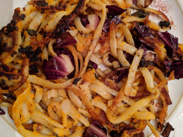 Another day I had some leftover pasta that Barbara had made. It had butternut squash and a good bit of cheese in it. I chose to add some contrast to the rich flavors, using radicchio di Treviso and some almond milk, then roasting it in a very hot oven. Crispy and good. Barbara decided to add a French chocolate cake to the menu that night. That was pretty special, too.