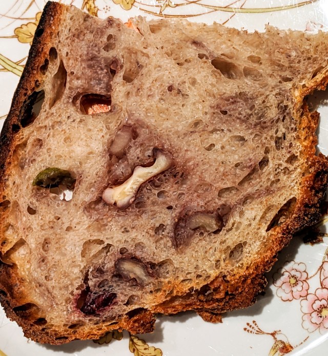 Year end was a busy time for cooking. Learned how to make pure levain bread — no added yeast. Made one version with whole grains, plus olives and walnuts.