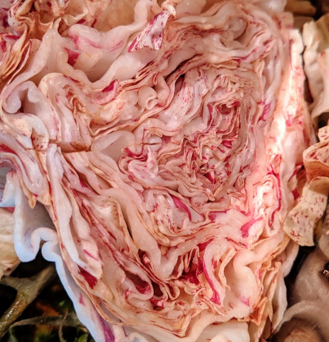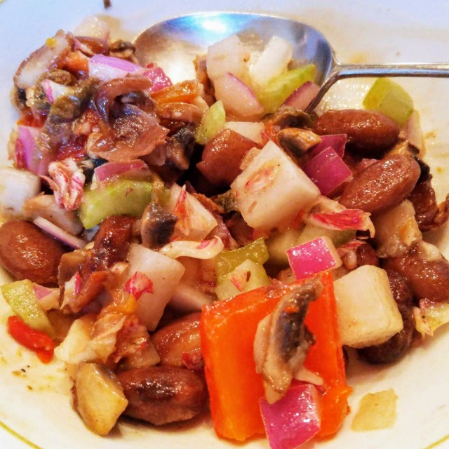 Finally, I can share both lunch and dinner today. I had cooked two batches of dried beans a few days ago; Borlotti from Gustiamo, and Caballero from Rancho Gordo. These had been part of several dishes already (especially the white bean purée with the Caballeros), and it was time to finish the rest. The solution was a Bean Salad, with many of my favorite ingredients, including leftovers that needed to be consumed soon. Among the ingredients: