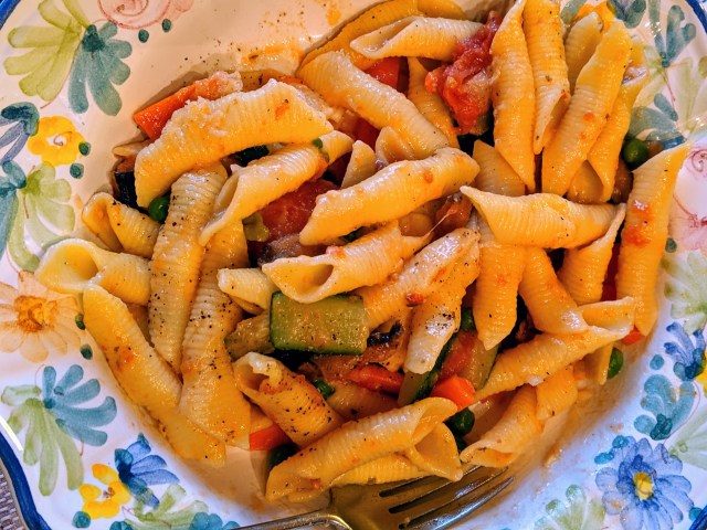 The next night it was my turn. Pasta, of course. I found a small package (250 gm.) of Gargagnelli from Abruzzo, for which I made a Ligurian-style vegetable sauce with zucchini, carrots, leeks, peas, and Pecorino cheese. It was a flavorful as it was colorful.