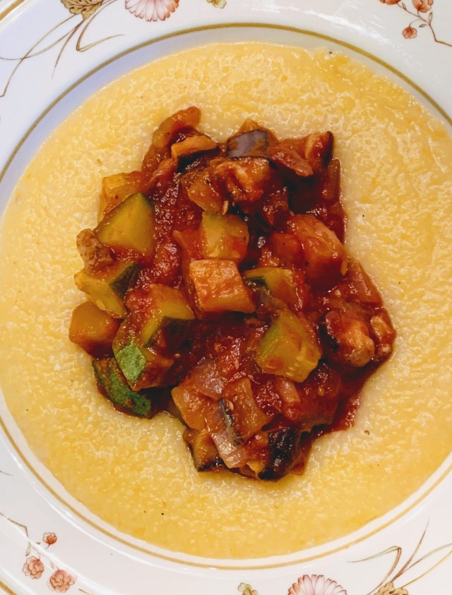 Barbara got us started with a wonderful and simple dinner — soft polenta, topped with zucchini and eggplant in tomato sauce. It was perfect for one of these cool Spring evenings.