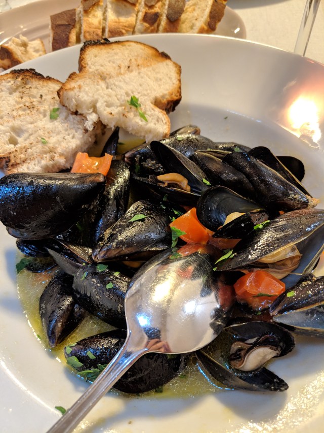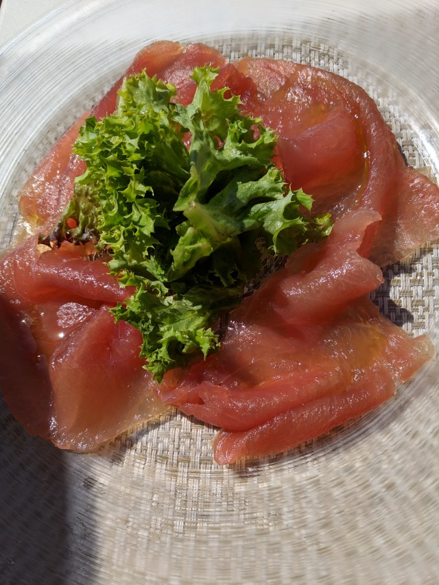 Dinner the first night — Cod with a sauce of cream of yellow tomato, black olives and artichokes