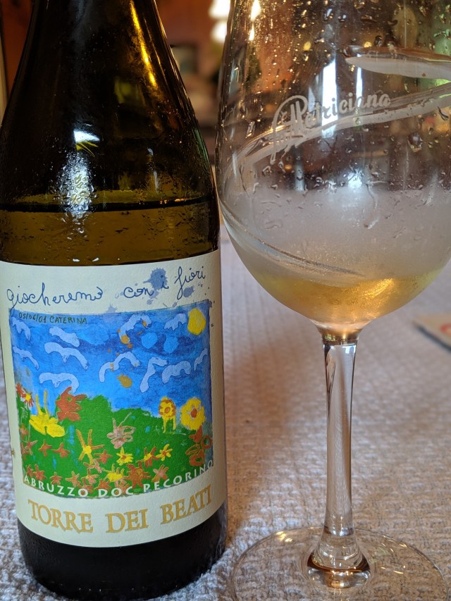The basic strategy was to cook the pasta until not quite done, Sauté the ingredients in stages to make the sauce, then combine them all in the saucepan to finish cooking and meld the flavors. Serve in a very large pasta bowl, accompanied by a few glasses of Torre Dei Beati Abruzzo DOC Pecorino wine (not the cheese).