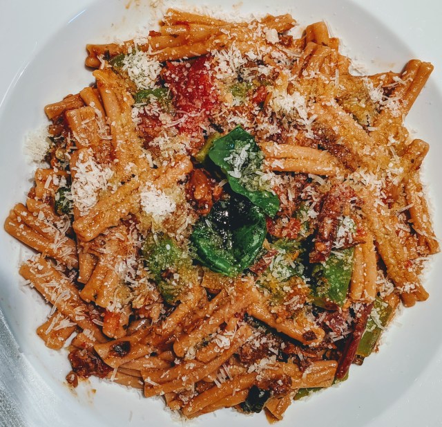 Toady’s pasta contains a list of ingredients which you would never purposefully buy with a plan to put them together. However, since I already had them in the refrigerator, it was an easy task, and the results were just short of fabulous.
