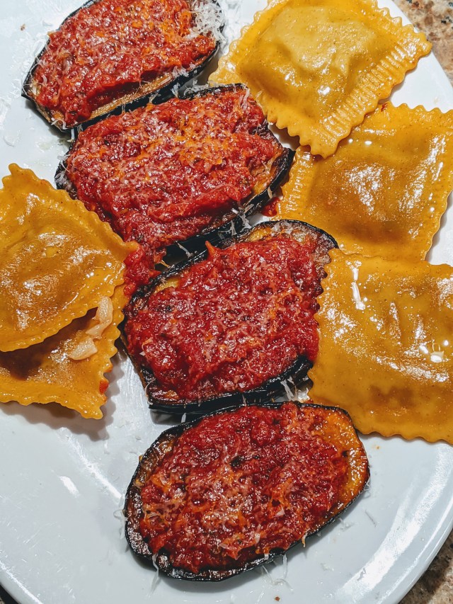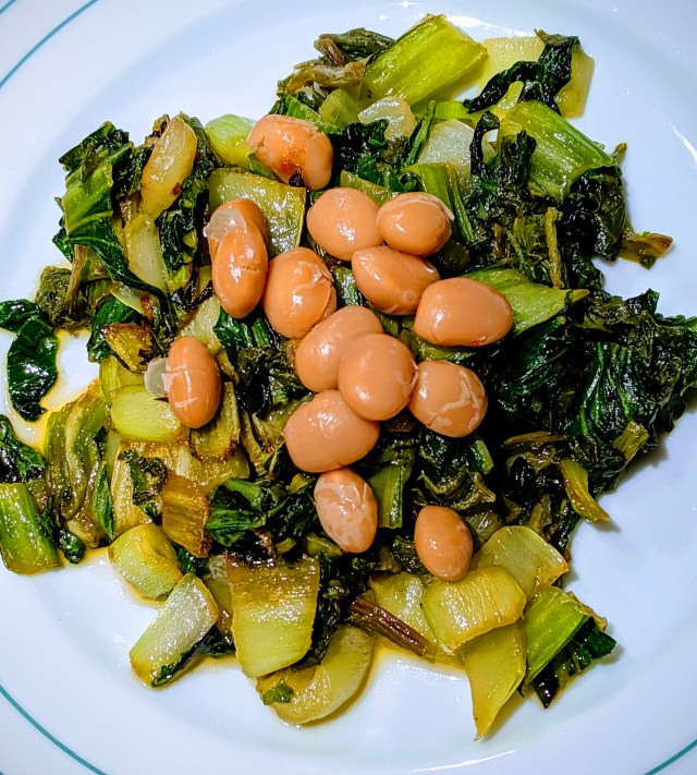 The next day for lunch, I added some rich Rancho Gordo beans to the Bok Choy. We also had some leftover eggplant-tomato tapas and a packaged ravioli of Braised Moroccan Chickpeas and Carrots from Valicenti pasta in Hollis, NH.