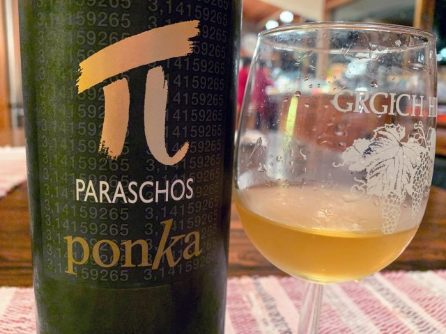 The wine choice was easy: we already had a white wine open in the refrigerator, I thought it would be a very good match, and it had Greek characters on the label — even though it was a 2010 Venezia Giulia from Friuli region of Italy, adjacent to the Slovenian border. It turned out to be especially compatible with the charred pieces of Halloumi. Who knew?