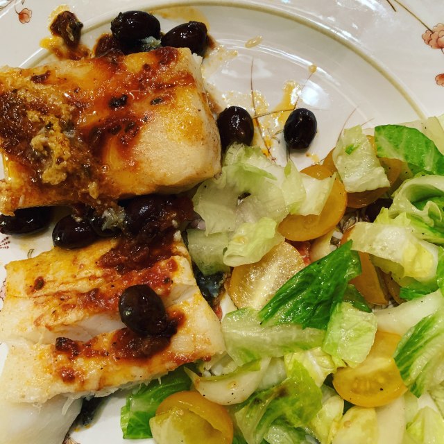 Dinner was a chunk of desalted Cod loin from La Tienda, pan/oven roasted, and then topped with our old friend, Ritrovo Bruschetta Sauce. It was accompanied by a simple salad of romaine, endive, and small tomatoes. The wine was a new departure, a 2014 Pacheca Riserva from the Douro Valley on our trip there in March. It was excellent with the rich tomato/olive/caper sauce and the fish.