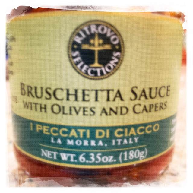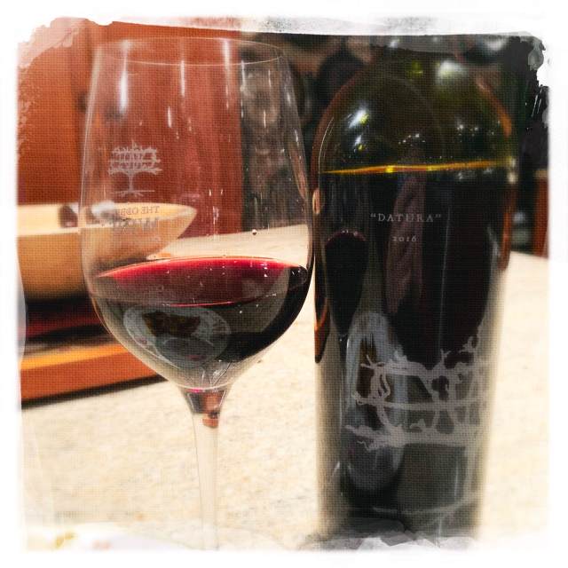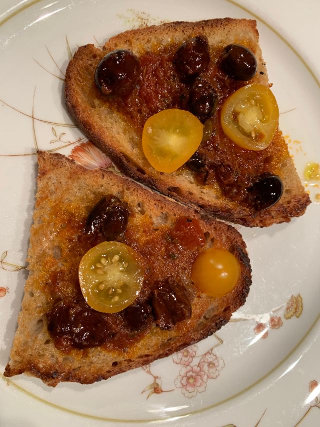 So, when I was hungry at 10:15 PM on Tuesday, bruschetta was top-of-mind. I pan-grilled a slice of the bread, and I opened a jar of a Bruschetta sauce with olives and capers, from Ritrovo, an Italian food supplier, topped it with some sliced cherry tomatoes, and opened a bottle of my most favorite Arizona wine, 2016 Datura, the 100% Petit Verdot from the Oddity Wine Collective. That was pretty spectacular itself.